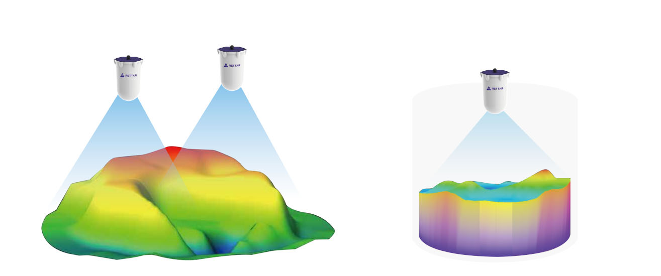 3D雷達物位計在太赫茲調(diào)頻連續(xù)波FMCW測距的基礎上,由內(nèi)部水平旋轉(zhuǎn)及俯仰結(jié)構(gòu)帶動其雷達傳感器進行多維度轉(zhuǎn)動以環(huán)視高分辨率掃描料倉以及料倉內(nèi)的物料表面,雷達傳感器每運行到一個預定角度則從其天線發(fā)射出微波信號,該微波信號碰到待測物后經(jīng)反射被天線所接收,然后將雷達傳感器運行到下一個預定角度,以此完成整個檢測周期的測量,獲得整個檢測周期中各個角度對應的物位測量信息,結(jié)合各個角度信息、各個角度對應的物位測量信息以及3D雷達物位計的安裝位置進行運算處理,融合圖像處理、大數(shù)據(jù)分析、AI人工智能、機器學習、三維點云轉(zhuǎn)換,建立三維空間坐標系,獲得三維點云坐標值,從而呈現(xiàn)三維可視化圖像,并據(jù)此計算獲得體積、質(zhì)量、料位等相關參數(shù)。